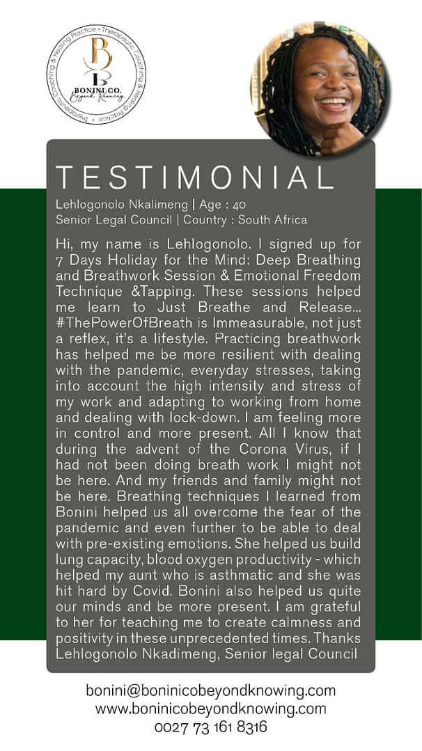 The space between therapy and coaching. The essence of therapeutic support techniques like NLP (Neuro-linguistic Programming) and Breathwork is very effective in dealing with anxiety, panic, fear, and how you identify yourself because of negative emotions and memories.